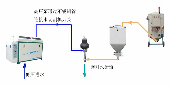 一套完整的水射流切割系統(tǒng)是由超高壓泵、水切割平臺、CNC控制系統(tǒng)及自動供砂系統(tǒng)組成。